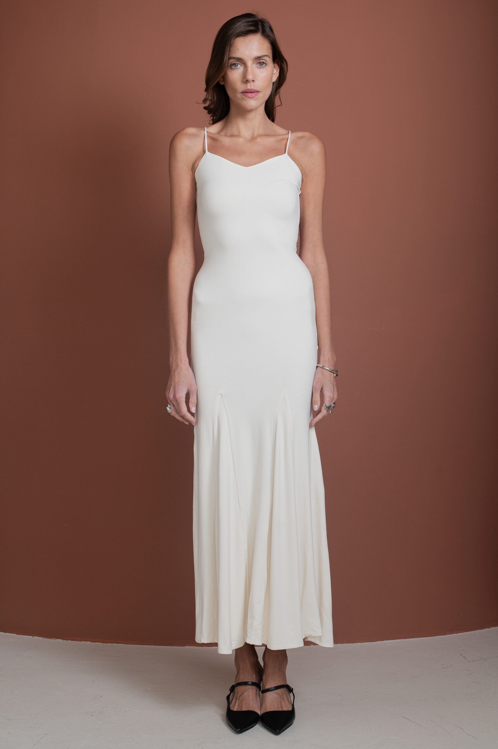 Defined waistline with a sculpted bodice and soft movement through the skirt, designed to enhance the silhouette while maintaining lightness and balance.